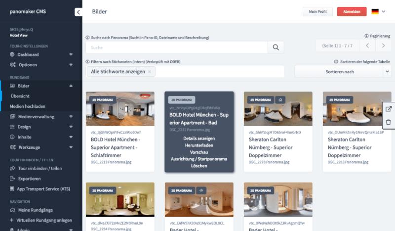 Heute können Rundgänge so viel mehr als einfache 360-Grad-Bilder enthalten. Wir haben eine Medienverwaltung geschaffen, mit der du alle deine Inhalte verwalten kannst: